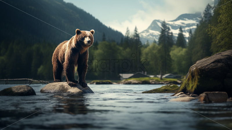A brown bear fishing in a lake at the foot of the mountains
