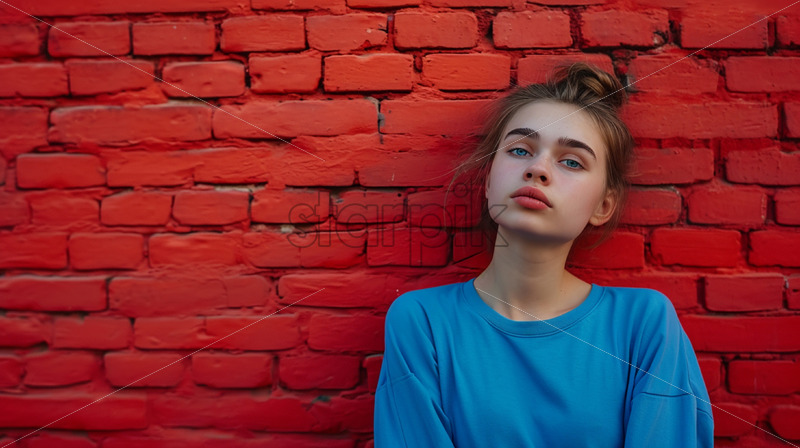 Caucasian woman in a jacket and shoes posing on a chair with monotonous background
