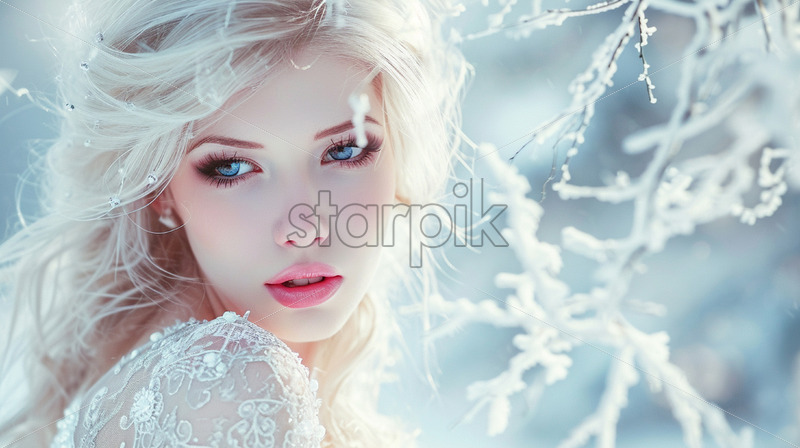 Home » Shop » Uncategorised » A beautiful girl with blond hair in a white dress in winter on the snow
