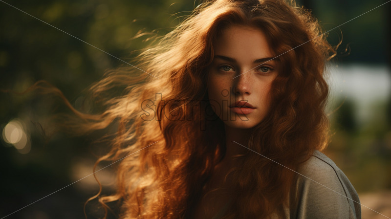 Portrait of a young woman with curly hair and blue eyes in black medical mask with water on the background