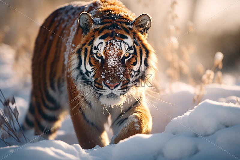 A beautiful tiger walks through the snow