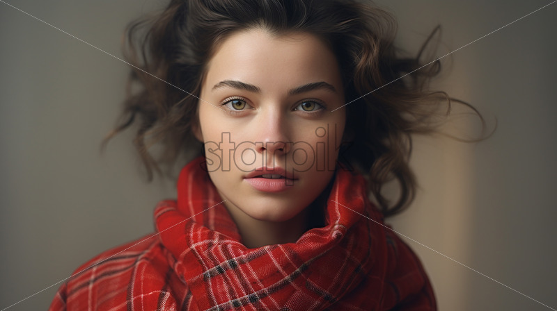 Close-up shot of a young caucasian girl with curly long dark brown hair and bangs. Freckles on the face. Expressing tenderness. Isolated background