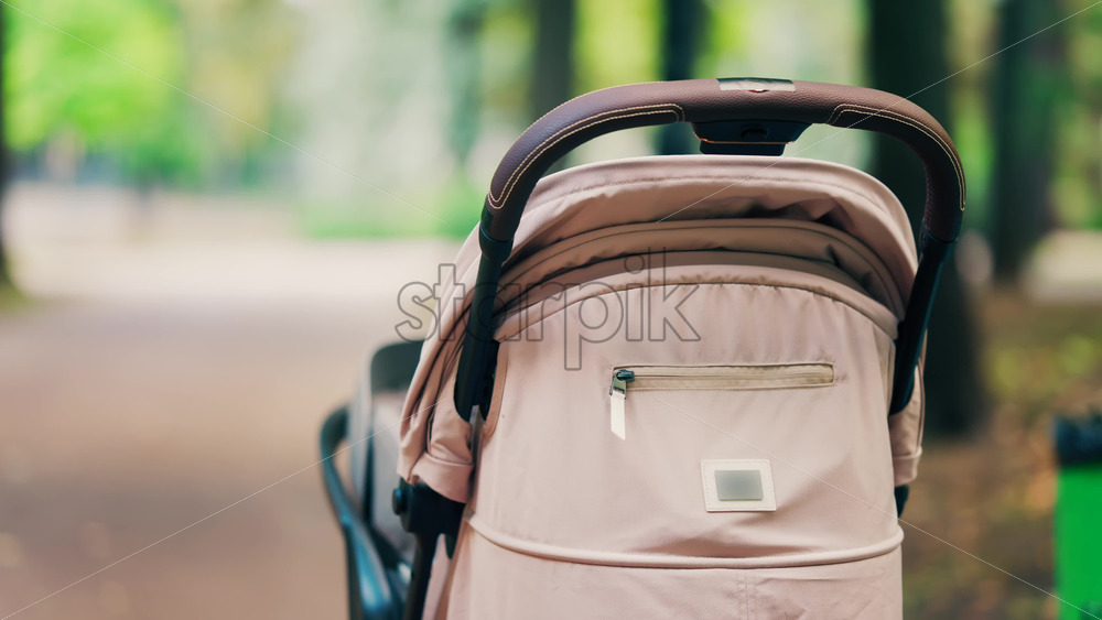 A beige baby stroller parked on a forest path in a park Royalty Free Stock Video Footage