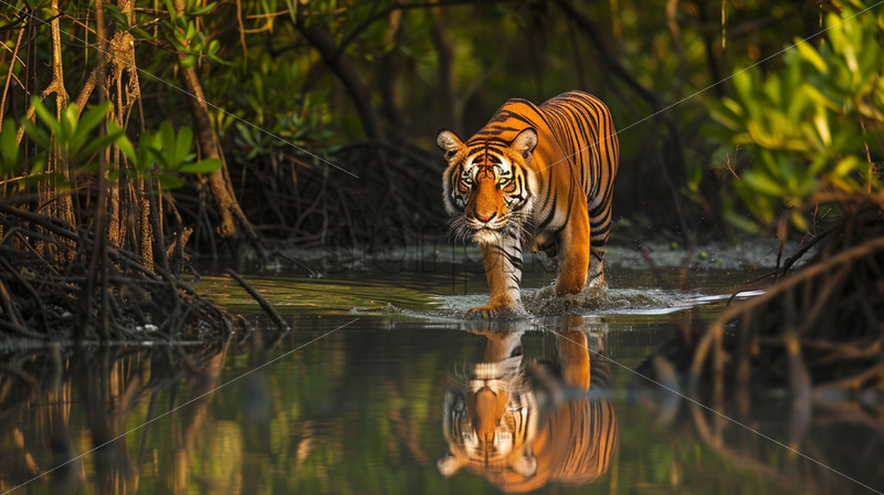 Massive and powerful Bengal tiger, its golden fur shimmering in the dappled sunlight