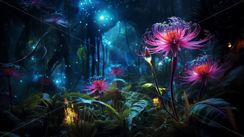 A bioluminescent spectacle as the jungle comes alive with glowing flora and fauna in the mystical twilight