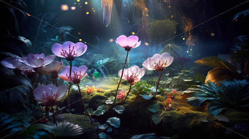 A bioluminescent spectacle as the jungle comes alive with glowing flora and fauna in the mystical twilight