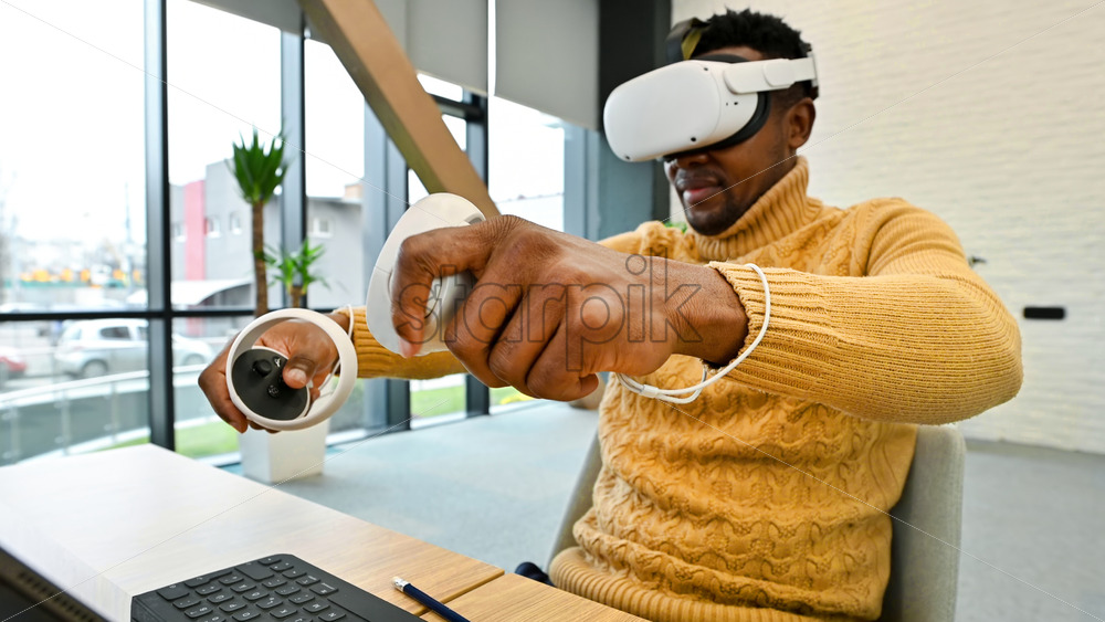 A black man exploring virtual reality using VR glasses and controllers in an office