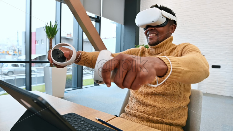 A black man exploring virtual reality using VR glasses and controllers in an office. Slow motion Royalty Free Stock Video Footage