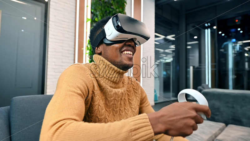 A black man exploring virtual reality using VR glasses and controllers in an office. Slow motion Royalty Free Stock Video Footage