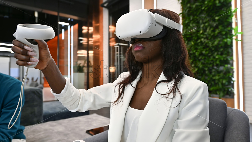A black woman exploring virtual reality using VR glasses and controllers in an office