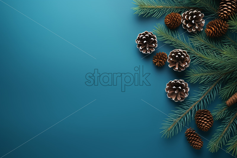 A blue Christmas background with cones, fir branches