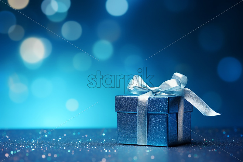 A blue gift on a blurred holiday background