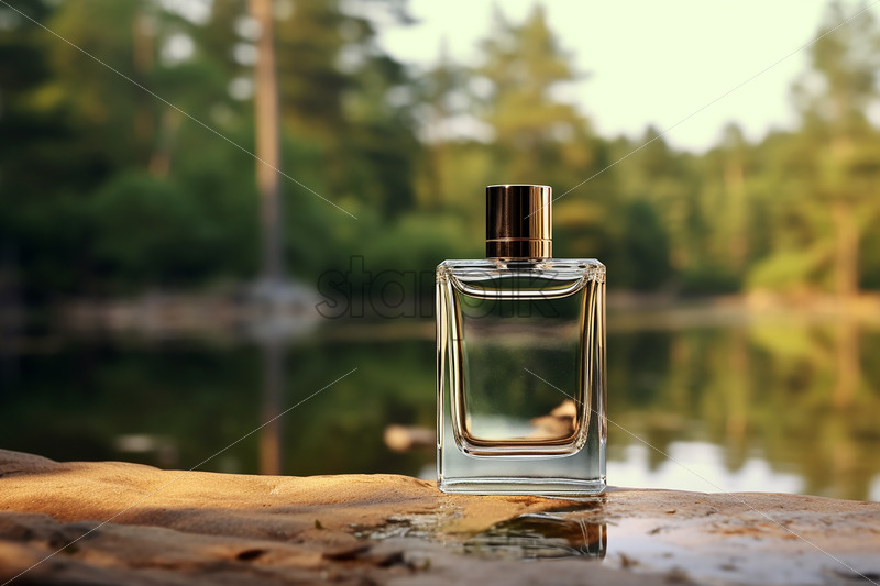 Home » Shop » AI Illustration » A bottle of luxury perfume on the bank of a river in the forest