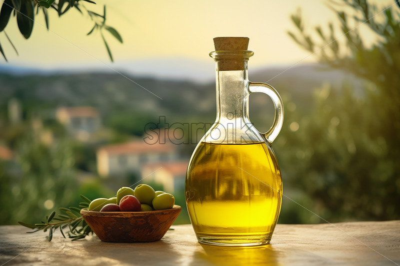 A bottle of olive oil against the background of an Italian city