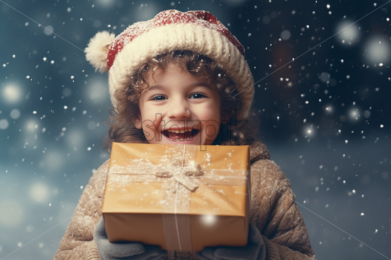 A boy holding a gift outside, in the winter