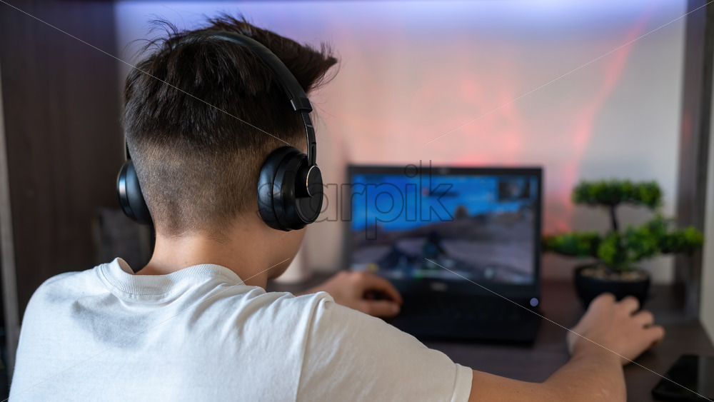 Teen smiling boy in headset playing video games in video game club with blue and red illumination