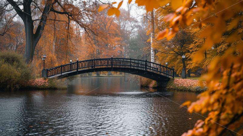 Autumn in the mountainous area next to a river, and among the trees there is a wooden cabin