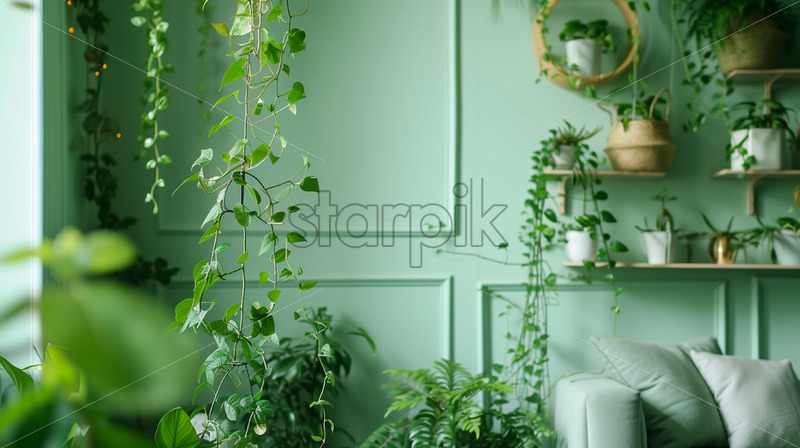 Modern house in the country side, minimalist wall and lounge, classy lounge with wooden shelves and indoor plants, relaxing living room