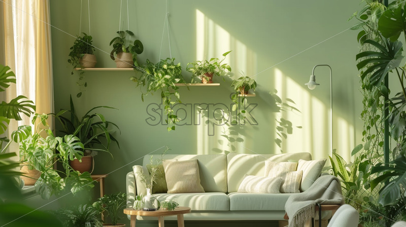 Modern house in the country side, minimalist wall and lounge, classy lounge with wooden shelves and indoor plants, relaxing living room