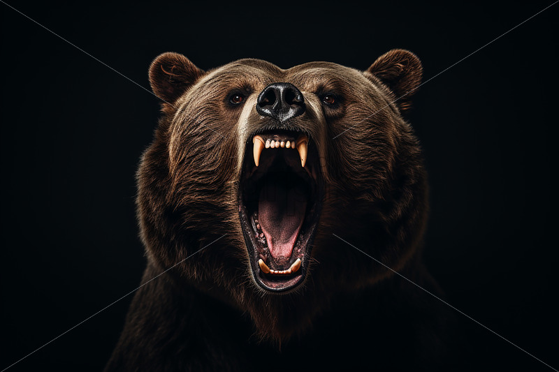 A brown bear with its mouth open on a black background