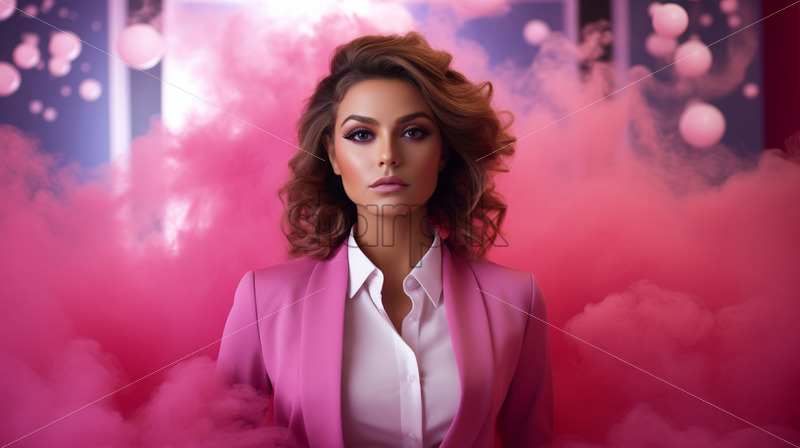 Young woman posing in a studio with red walls and furniture. Old vintage TV