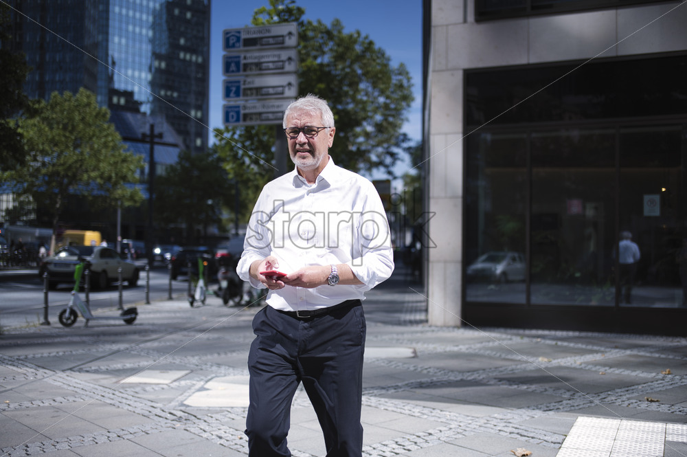 Home » Shop » photo » A business man wearing glasses and white shirt on the street in Frankfurt, working on mobile phone, Germany