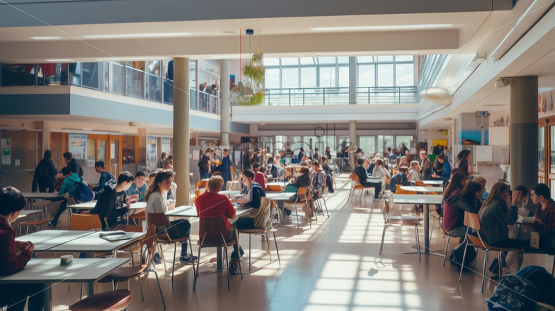 A bustling school cafeteria during lunchtime