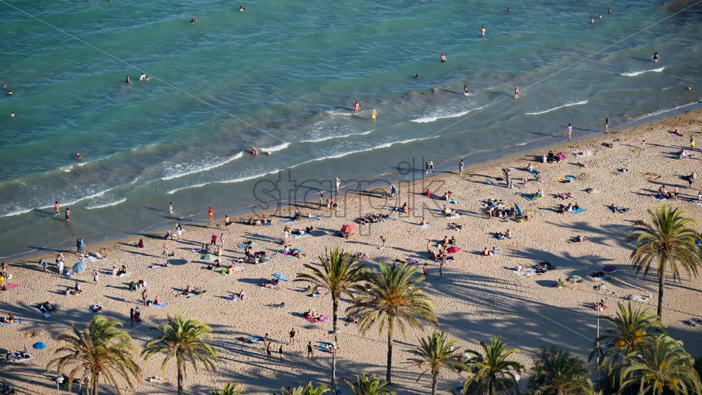 A busy Mediterranean city beach with turquoise waves, palm trees and sunbathers spread across warm sand in Alicante, Spain Royalty Free Stock Video Footage