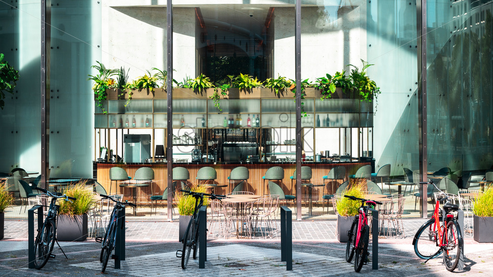 A cafe with modern interior in Frankfurt, Germany. View from the street, transparent wall, parked bikes