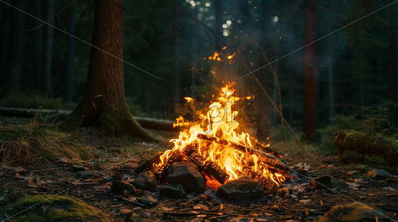 A group of happy young friends near a campfire at glamping, night. Two men and women. Frying marshmallow