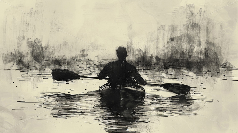 An explorer paddles through serene waters, surrounded by breathtaking scenery and wildlife. Their face is lit up with excitement and wonder as they navigate the twists and turns of a winding river or tranquil lake.