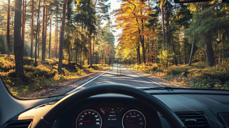 A car driving on the road in the forest, view from the driver’s seat