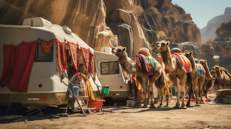 A caravan of camels adorned with vibrant fabrics navigating through a rocky desert canyon