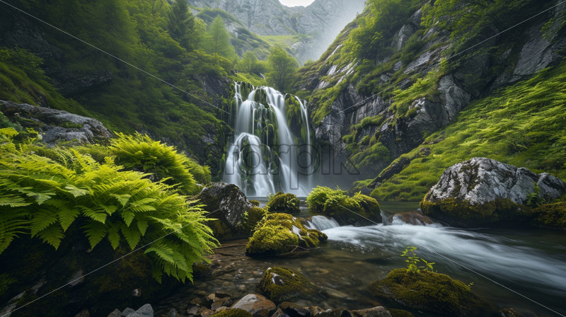 Home » Shop » Uncategorised » A cascading waterfall surrounded by emerald-green ferns and moss-covered rocks