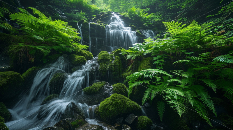 A cascading waterfall surrounded by emerald-green ferns and moss-covered rocks