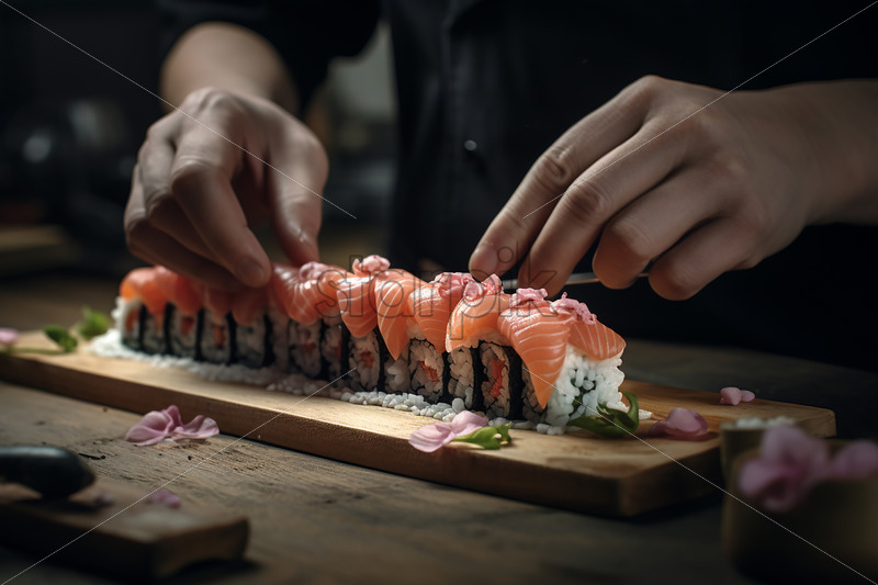Close up of a chef preparing nigiri on a white plate at the Tsukiji Fish Market in Japan Royalty Free Stock Video Footage