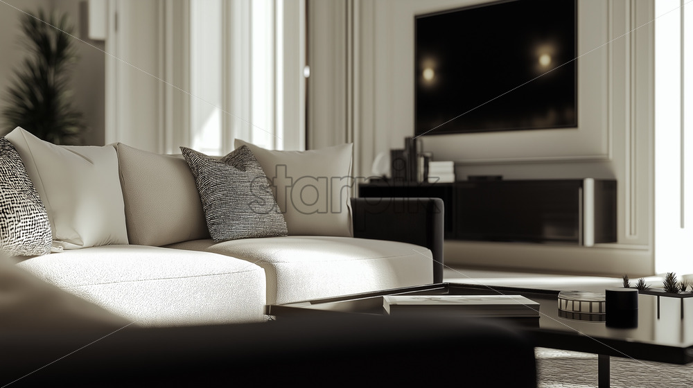 A monochrome living room with white walls, black furniture, and soft beige accents