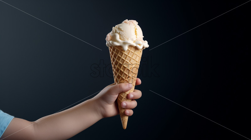 Woman hands holding ice-cream with waffle. Old buildings and Lake Como on background. Menaggio, Italy Royalty Free Stock photo
