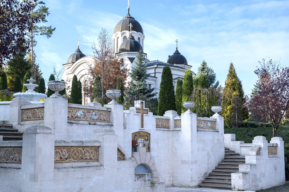 Home » Shop » photo » A church situatetd in the Curchi monastery. Stairs with wellspring and lush greenery. Good weather in Moldova