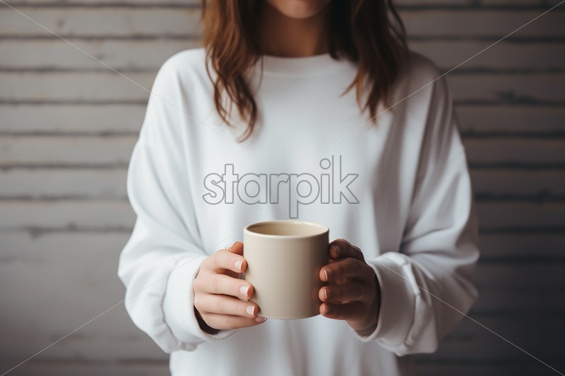 Woman in a warm sweater holding a mug winter, snowing, cold close up