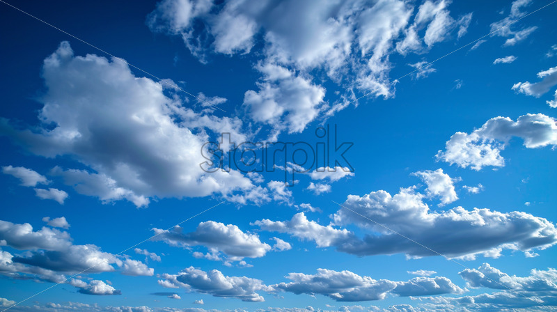 A clear blue sky with fluffy clouds lazily drifting overhead