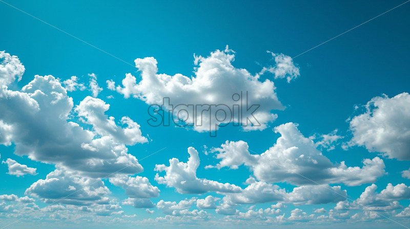 A clear blue sky with fluffy clouds lazily drifting overhead