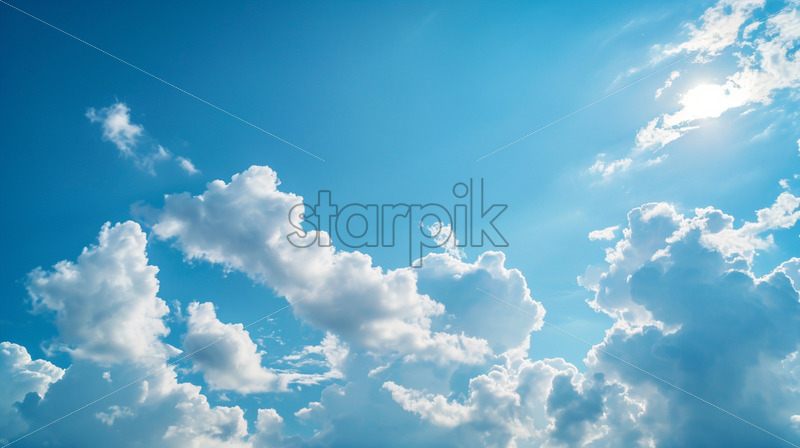 A clear blue sky with fluffy clouds lazily drifting overhead