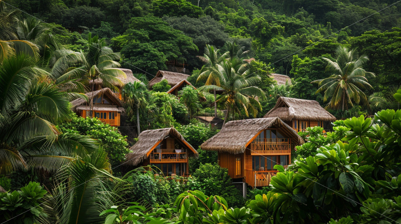 Home » Shop » Uncategorised » A cluster of charming beach bungalows nestled amidst lush greenery