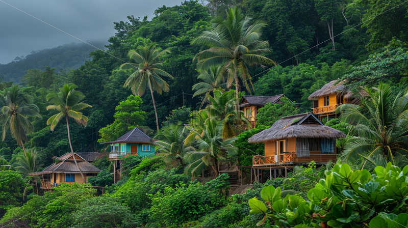 A cluster of charming beach bungalows nestled amidst lush greenery
