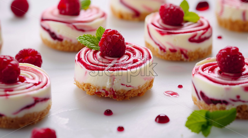 Home » Shop » Uncategorised » A collection of miniature cheesecakes with raspberry swirls and mint garnish on a clean white surface