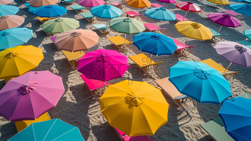 A colorful array of beach umbrellas and loungers