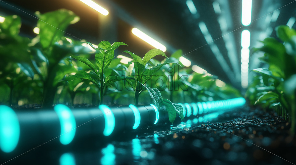 Home » Shop » AI Illustration » A concept art of a solar-powered quantum irrigation system, distributing water through glowing pipelines