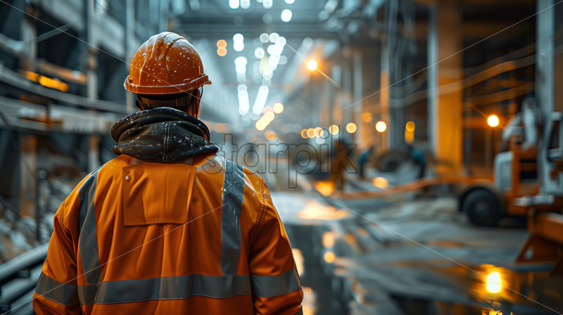 A construction worker, wearing complete PPE, diligently engages in masonry work, with blurred co-workers visible in the background, depicting a scene of safety and teamwork on the construction site