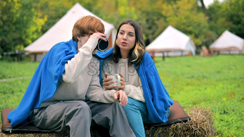 A couple getting out a tent, hugging each other and talking on a terrace at glamping. Lush forest around